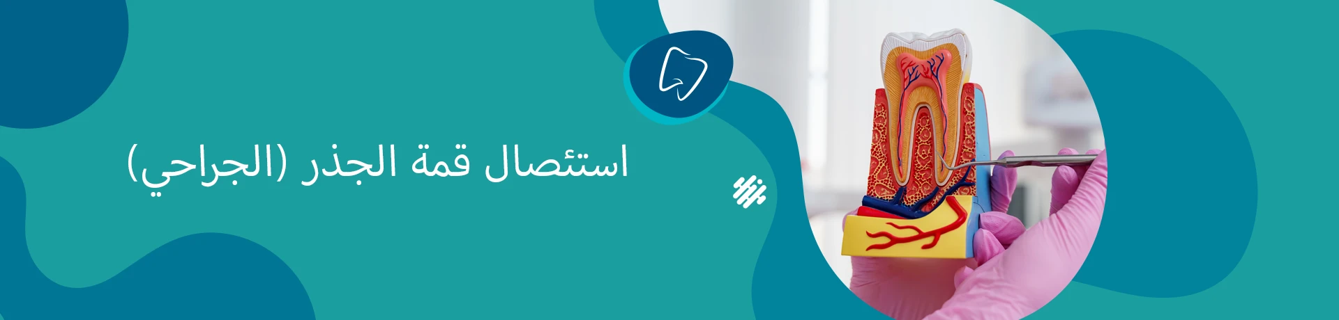 جراحة الاستئصال لقمة الجذر هي عملية جراحية تستغرق في المتوسط 30 دقيقة تحت التخدير الموضعي. بعد إجراء شق صغير في اللثة، يتم تنظيف الأنسجة المصابة. إذا كانت العدوى في نهاية جذر السن قد بدأت تؤثر على الأسنان القريبة، يمكن إجراء علاج قناة الجذر واستئصال نهاية الجذر لتشمل الأسنان المجاورة.